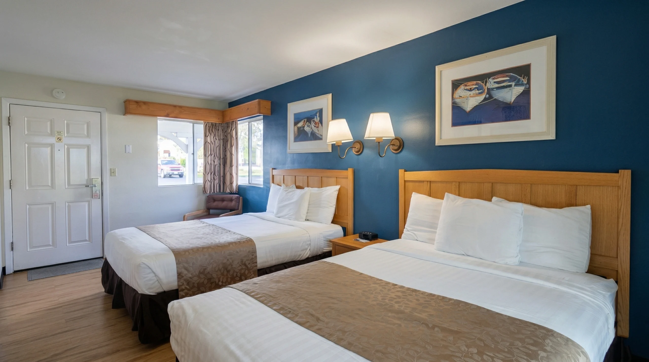 Welcome to Skylark Shores Resort, your serene escape in the heart of Lakeport. Our resort, nestled along the tranquil shores of the lake, offers a perfect blend of relaxation and adventure. Discover the ultimate in comfort and breathtaking views with our Lake View Rooms featuring Two Queen Beds, ideal for families, friends, or anyone seeking a peaceful retreat.