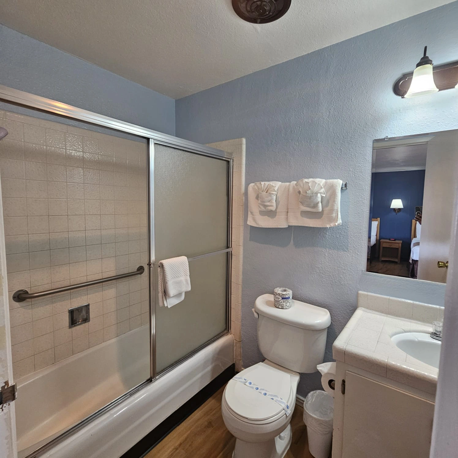 Unwind after a day of adventure in our elegant bathroom featuring a soothing bathtub and premium toiletries.