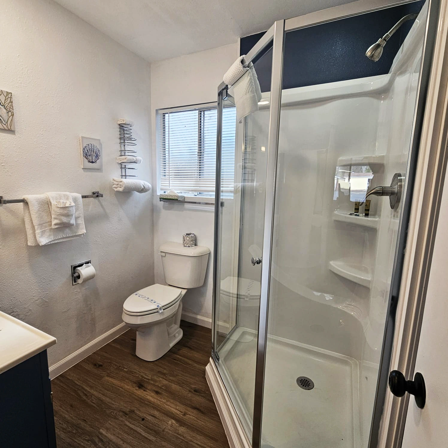 Refresh yourself in a modern bathroom equipped with premium toiletries and soft, fluffy towels.
